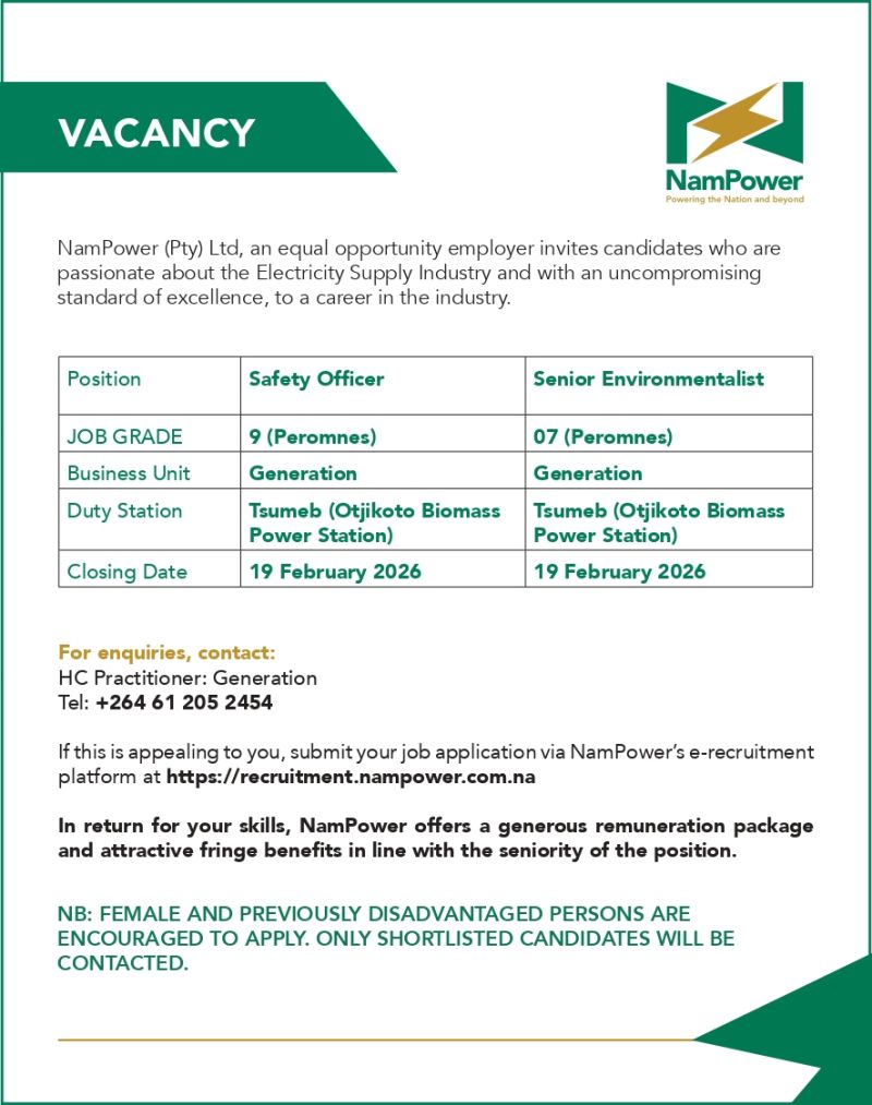 Nampower is inviting passionate professionals to apply for the positions of Safety Officer and Senior Environmentalist at the Otjikoto Biomass Power Station in Tsumeb. Closing date: 19 February 2026 Apply online: https://recruitment.nampower.com.na/ #oppotunity #VacanciesNamibia #Biomass