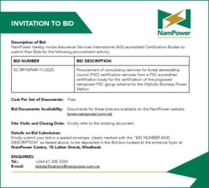 Read MoreNamPower is inviting bids of consultancy services for forest stewardship council (FSC) certification services from a FSC accredited certification body for the certification of the proposed NamPower FSC group scheme for the Otjikoto Biomass Power Station Clarification Closing Date: 14 July 2025 (Namibian Time) Bid Deadline: 01 August 2025 at [...]